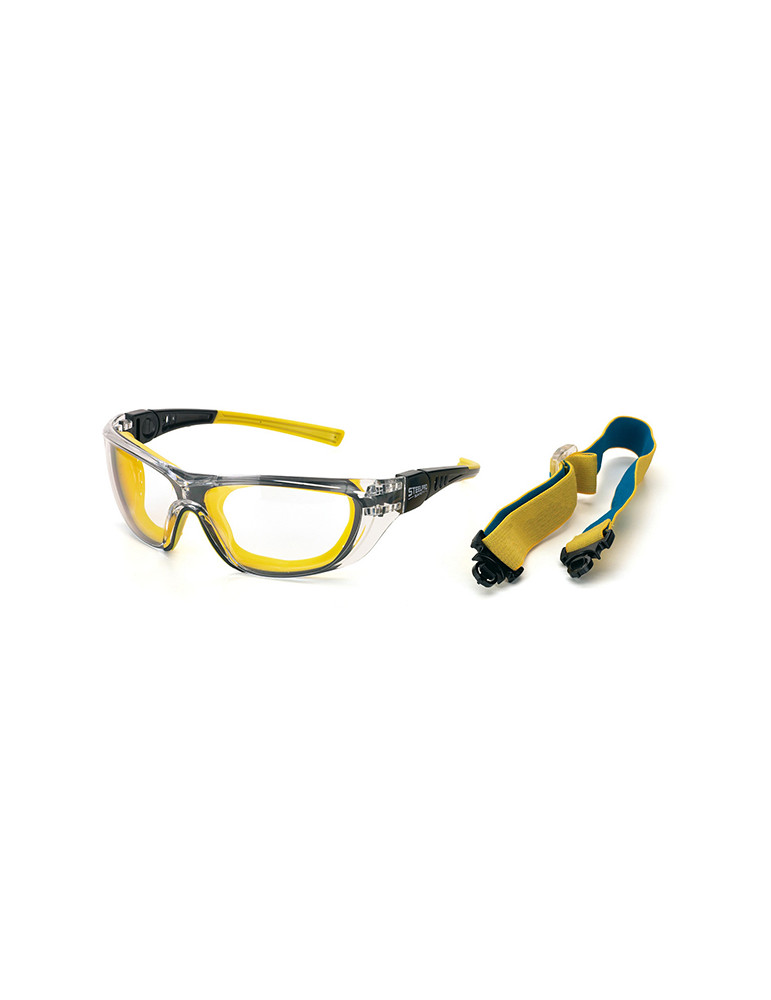 Ocular claro unilente de policarbonato, con tratamiento anti-ralladura y antiempañante, con amplio campo visual. Con cinta elástica.