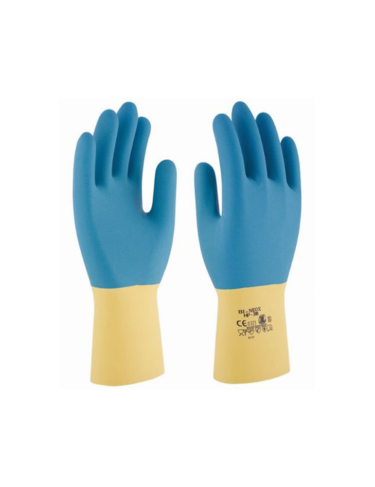Guante sin soporte de policloropreno (neopreno) sobre látex natural. Flocado interior. Libre de ceras y siliconas. Bajo contenido en proteínas. Químicamente endurecido. Relieve en la palma para potenciar el máximo agarre en condiciones húmedas o seca