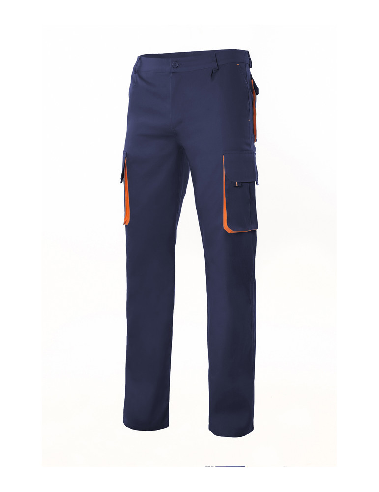 PANTALÓN MULTIBOLSILLOS velilla Bicolor con pinzas y goma elástica en el interior de la cinturilla de la espalda. Dos bolsillos con fuelle y cuatro con fuelle, tapeta y velcro. Pespunte trasero de seguridad. Azul/naranja. Tallas 38 a 56.