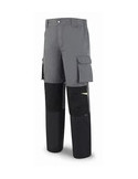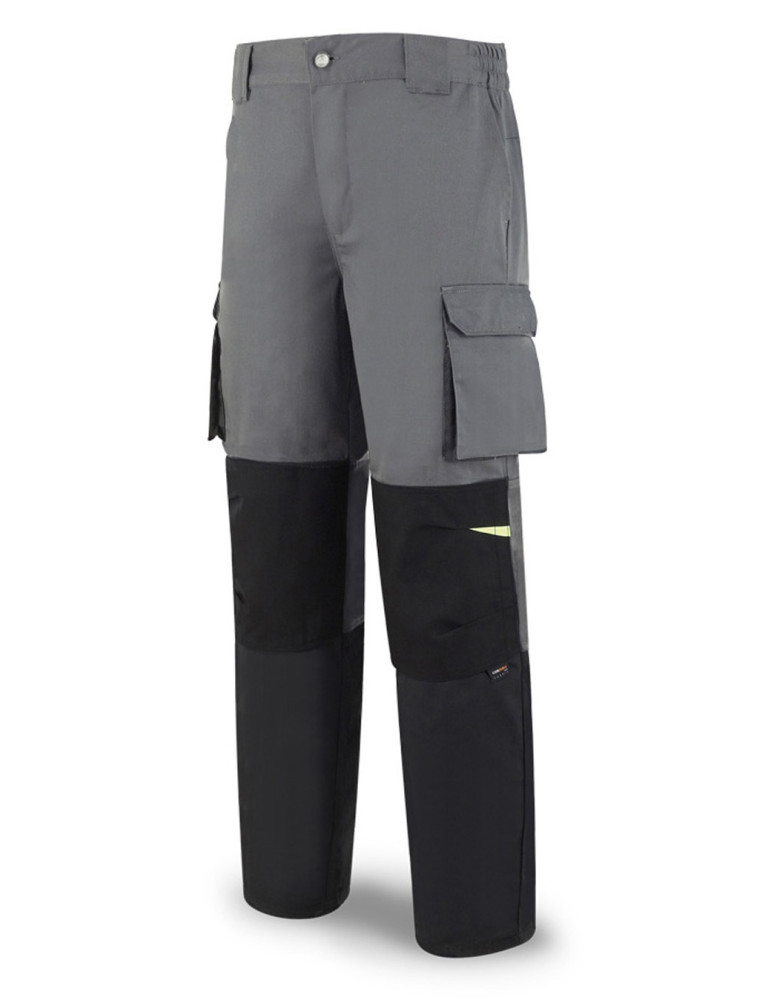 Tergal 245 g. Color gris oscuro/negro. Ajuste elástico en cintura. Rodillas reforzadas con tejido. Ribetes y detalles en amarillo fluorescente. Culera. Dos bolsillos normales. Bolsillos con fuelle y tapeta con velcro en perneras. 2 Bolsillos traseros
