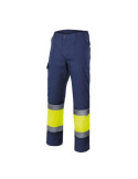 PANTALÓN BICOLOR ALTA VISIBILIDAD VELILLA Pantalón bicolor de alta visibilidad con dos cintas reflectantes en las piernas y bandas flúor entre ellas. Pliegues, goma elástica en el interior de la cintura trasera y seis bolsillos, cuatro de ellos con tapeta y velcro. Pespunte trasero de seguri