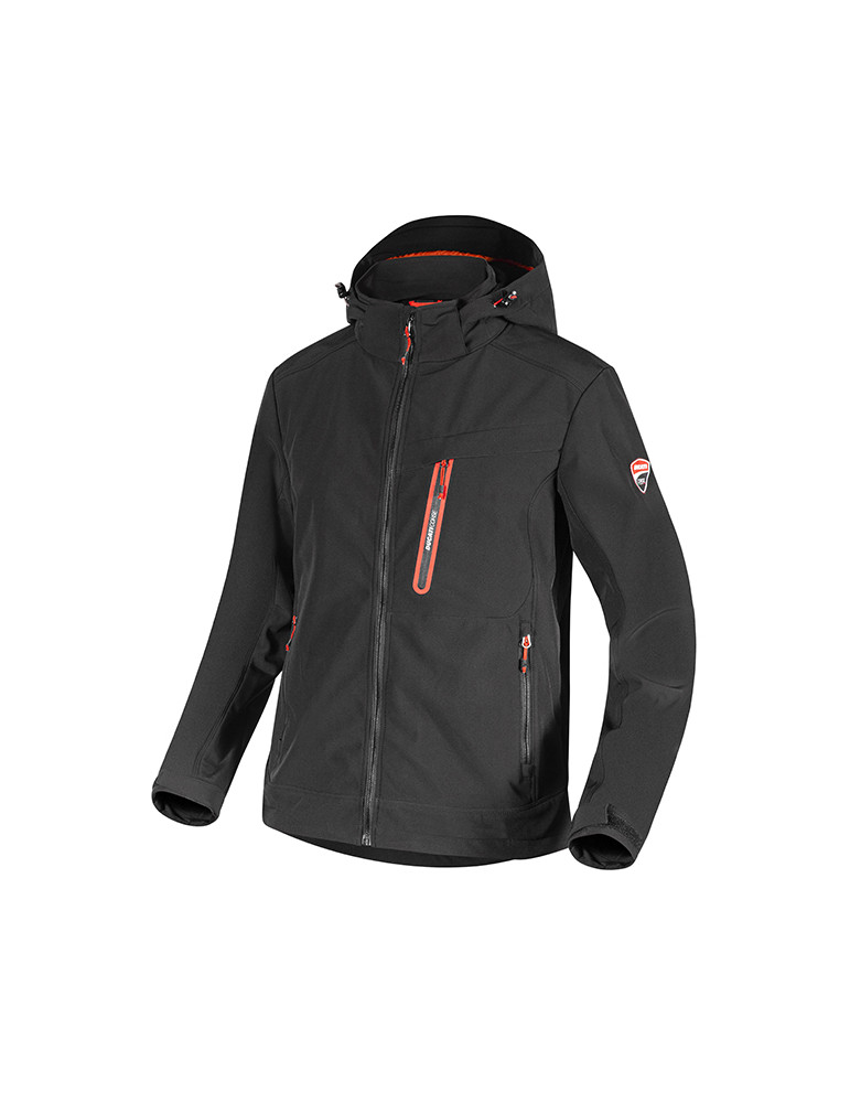 Chaqueta softshell personalizada con DUCATI CORSE. Capucha desmontable con tres ajustes, dos bolsillos laterales y un frontal con cremallera, bolsillo interno con velcro. Parte posterior más larga para mejorar el ajuste. Cordón ajustable en la cintur