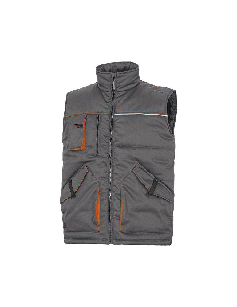 Cierre por cremallera antifrío. Bajo de la prenda ajustado por cordón elástico. 9 bolsillos. Tejido 65% poliéster 35% algodón. Forro Tafetán poliéster acolchado de algodón. Tallas M - XXL. Color Gris - Naranja.
