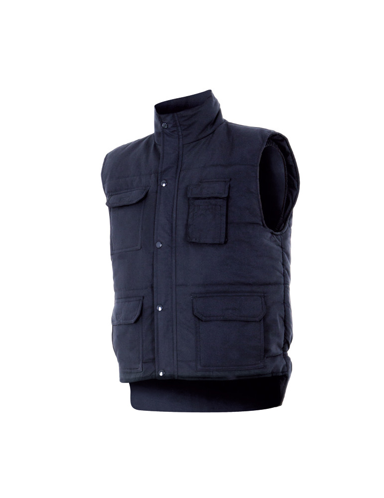 Acolchado con cremallera oculta, con cortavientos y bolsillos exteriores e interiores. Color azul marino. Tallas M - XXL.