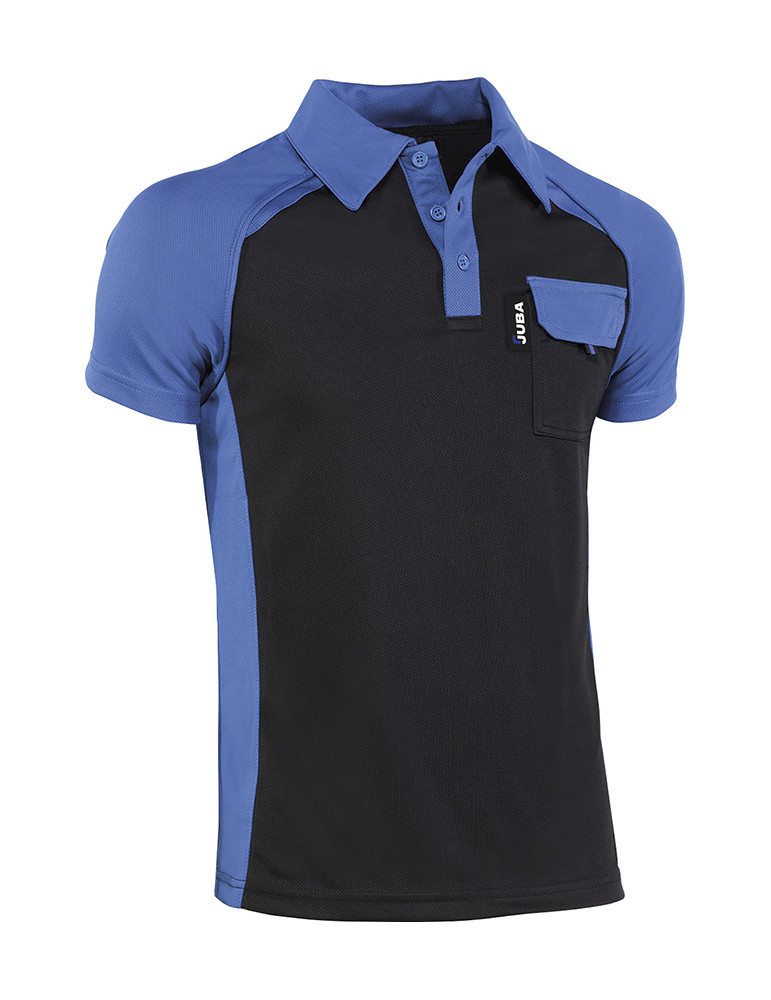POLO TOP RANGE 994 JUBA transpirable, manga corta, bolsillo. Color negro con detalles en azulina.