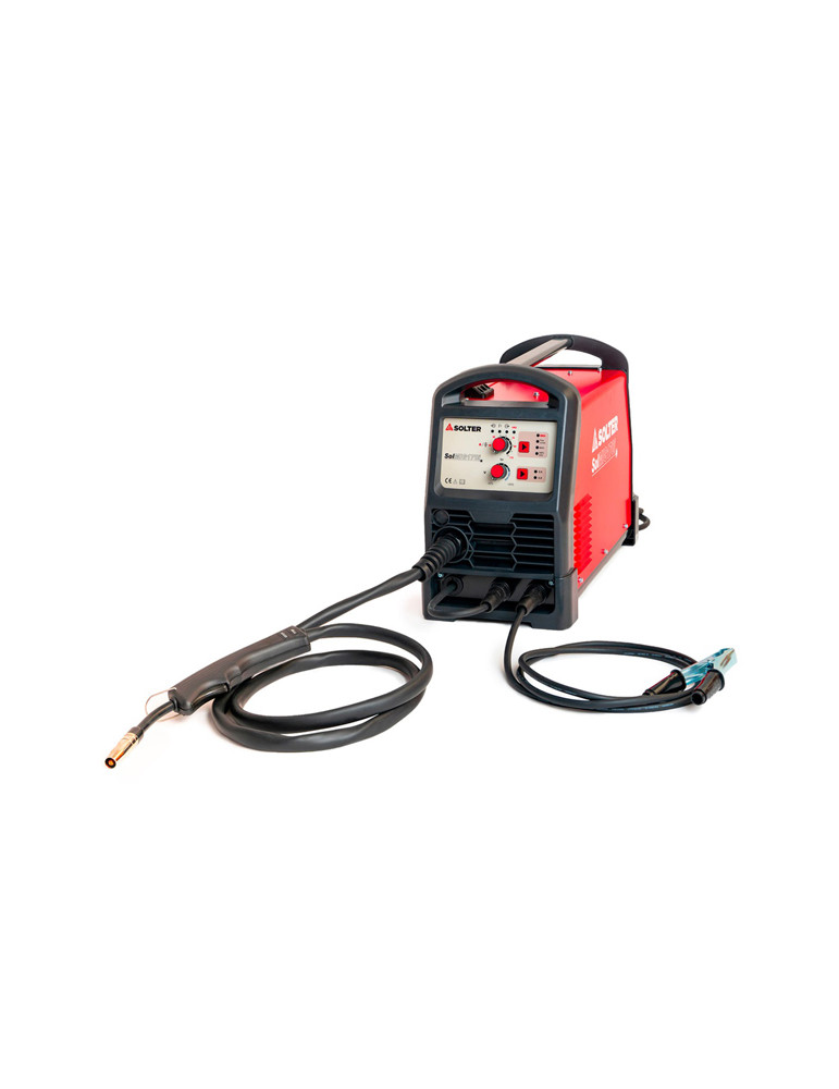 MAQUINA HILO SOLMIG 170 SOLTER Equipo multiproceso (Electrodo,MIG/MAG, TIG). Soldadura de hilo con y sin gas hasta 0,8mm. Conexión 230V-1ph. Admite bobina D100 (1 kg) y hasta D200 (5 kg). Incluye pinza de masa y antorcha MIG.
