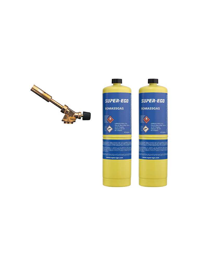 Completo pack de soldadura que incluye el soplete Super Fogo Plus de Super Ego y dos botellas de gas MAPP, ideal para trabajos de soldadura blanda y fuerte con la máxima eficiencia y seguridad. Diseñado para ofrecer una llama tipo dardo precisa y pot