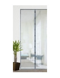 Malla mosquitera de poliéster gris de fijación al marco de la puerta mediante una cinta de autocierre adhesiva. Cierre central con imanes. Rápida y sencilla de colocar.