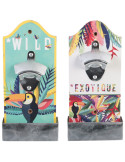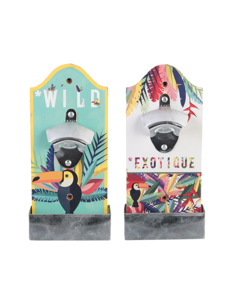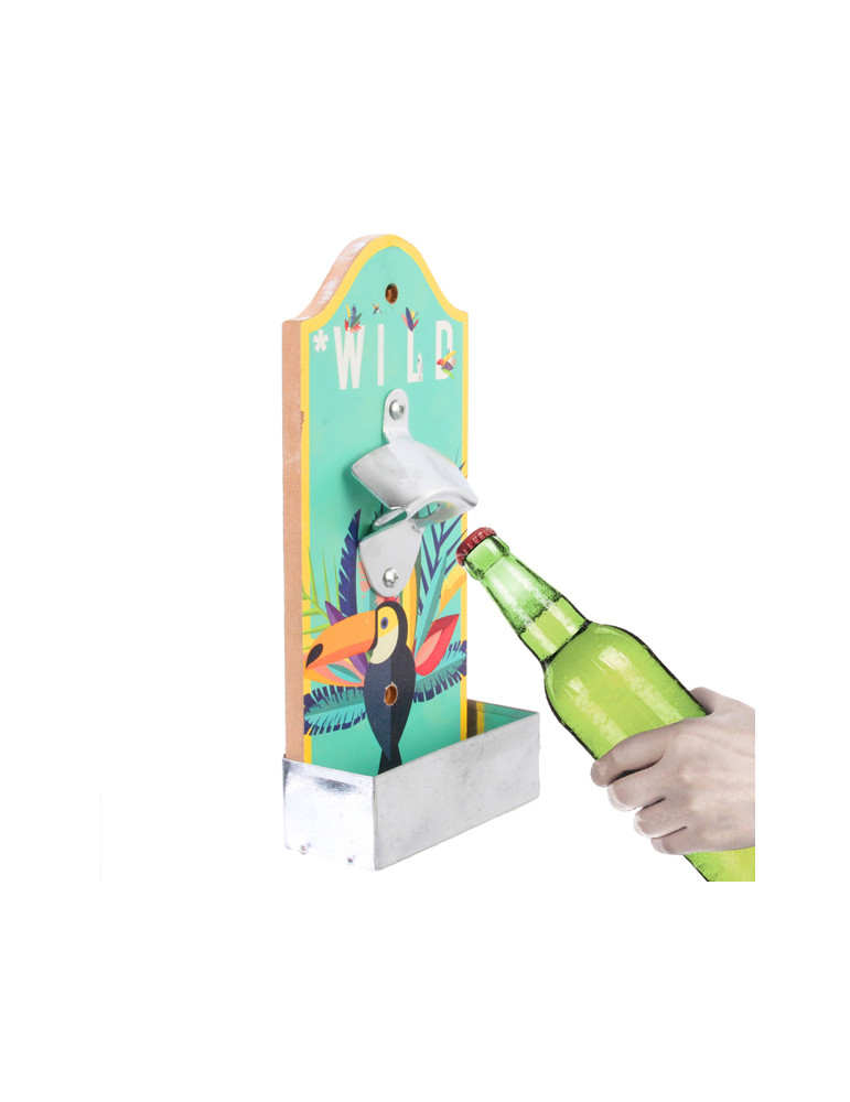 De metal y madera. Para apoyarlo o para fijarlo en la pared. Práctico y fácil de utilizar. El depósito recoge las chapas de las botellas. Medidas: 11,2 x 7 cm, h.23,5 cm.