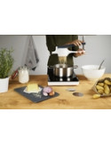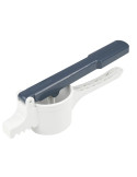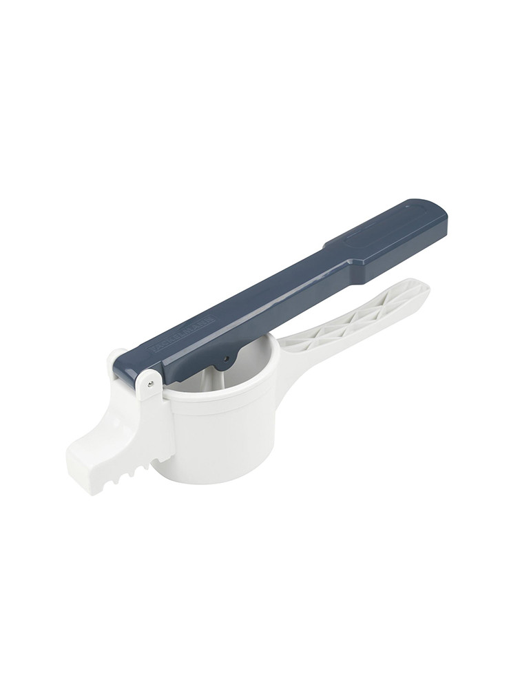 Cuerpo: plástico, partes funcionales: acero inoxidable, 350 x 90 x 125 mm, Para prensar o machacar patata, aguacate, etc…, 3 discos con agujeros de diferentes diámetros, mango robusto y ergonómico, incluye receta, 5 años de garantía, colores azul y g