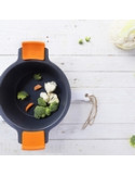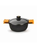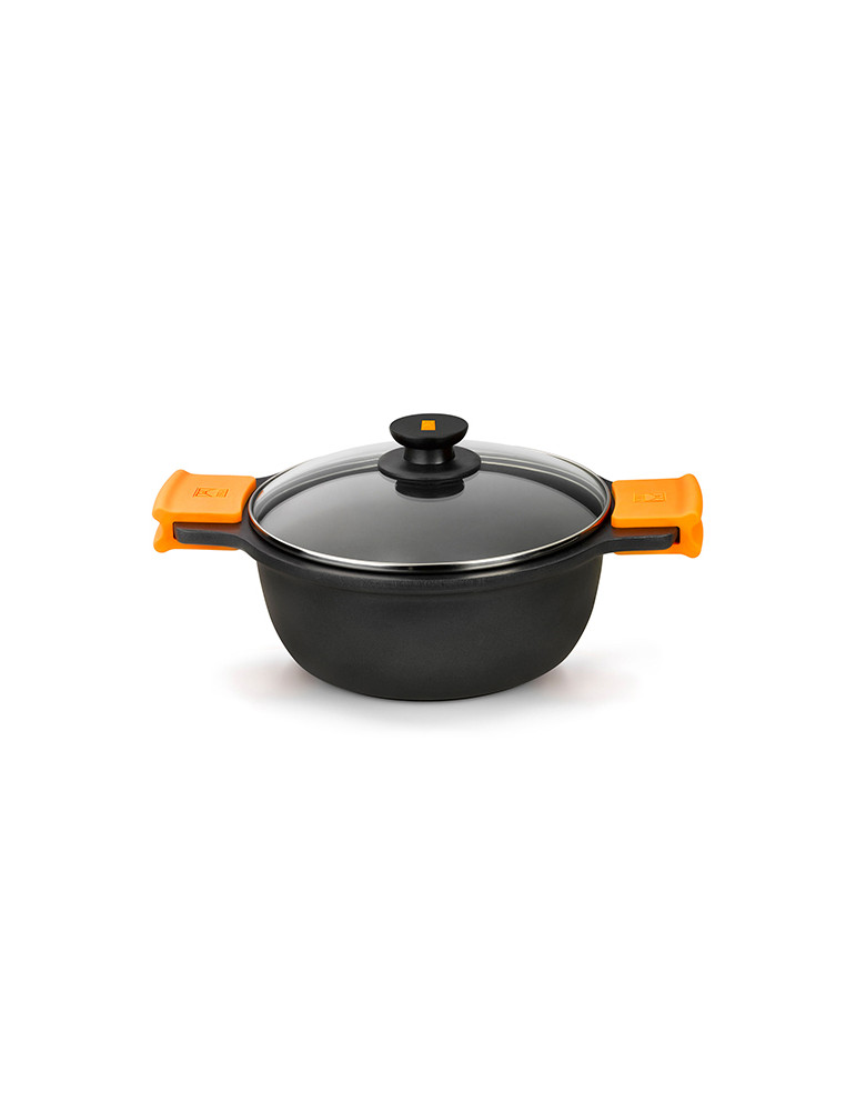 Con asas de silicona desmontables y tapa de cristal. En aluminio fundido, con fondo de gran espesor, apta para todo tipo de cocinas.