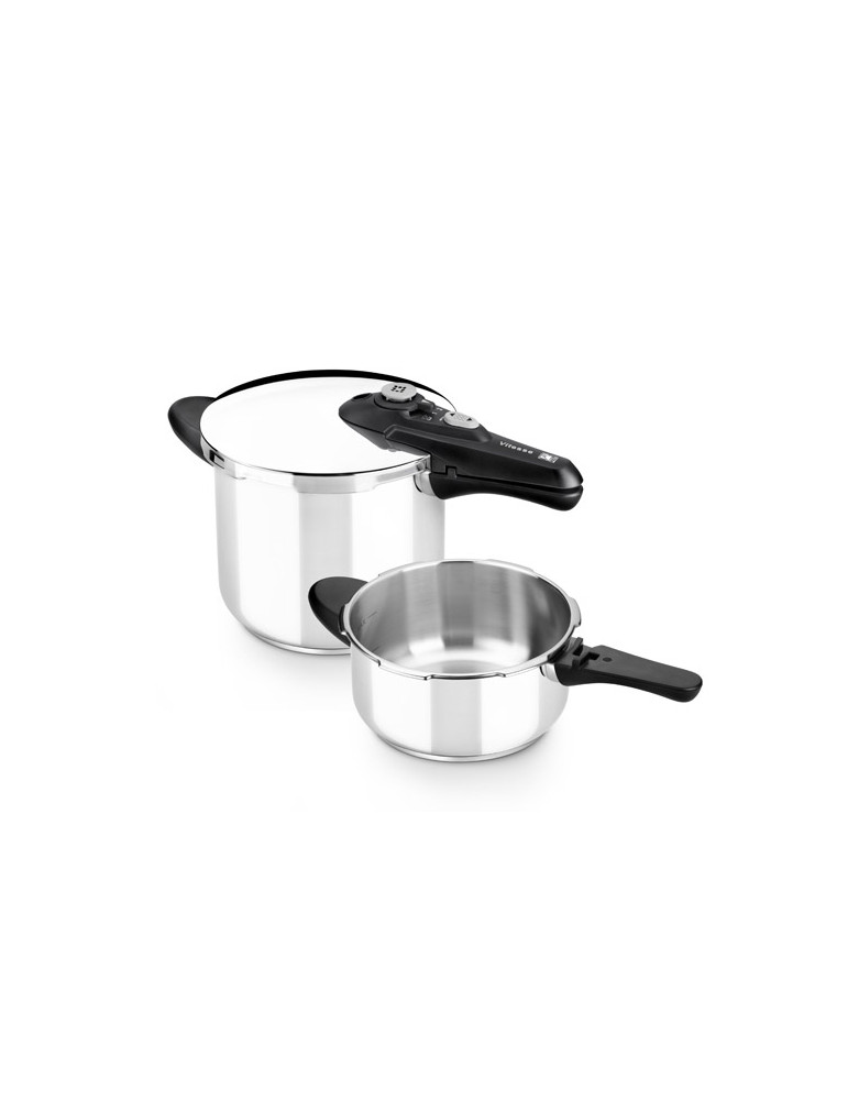 Acero inox. 18/10. Apto para todo tipo de cocinas incluida inducción. Olla a presión completa de 7 l + cuerpo de olla de 4 l.