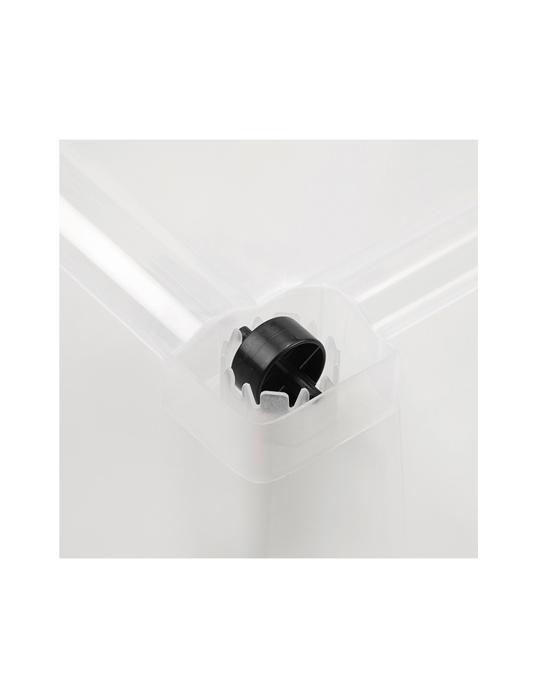 Cuerpo color transparente de copolimero random libre de ftalato que le confiere mayor resistencia a bajas temperaturas y más transparencia respecto a un copolímero random estándar. Diseño modular encastrable y apilable, tapa/asa con función bisagra.