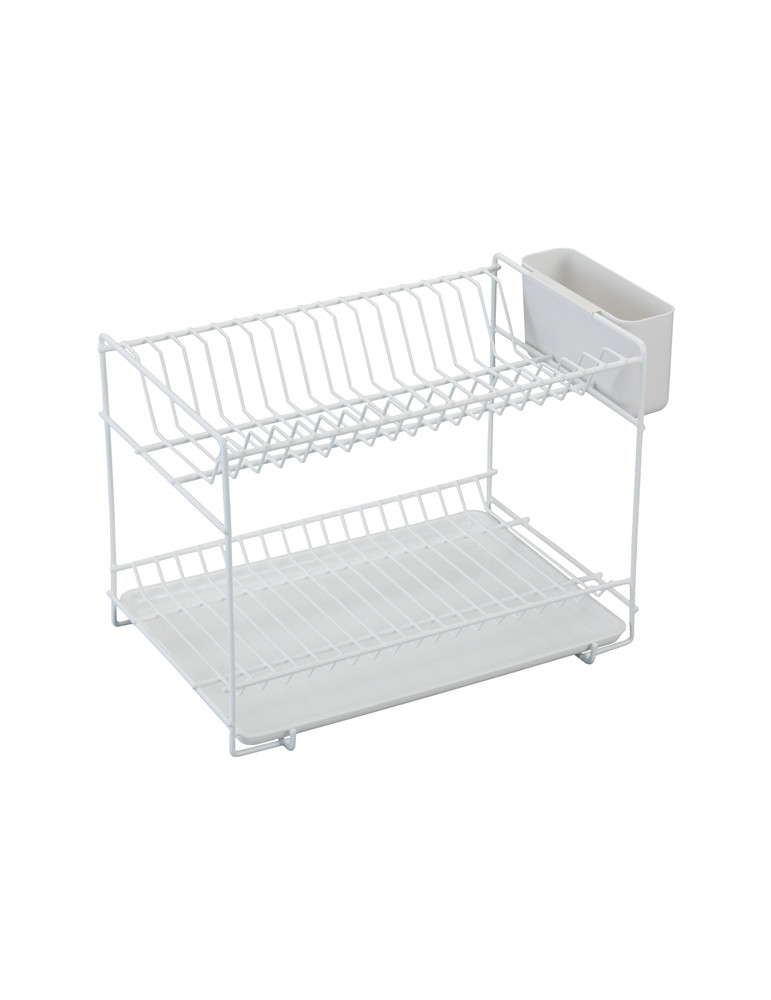 Escurreplatos en dos niveles, con capacidad para 18 platos. Fabricado en acero con recubrimiento plástico anticorrosivo de color blanco. Con bandeja para el agua en plástico de color blanco, muy práctica si desea utilizar el escurreplatos encima de u