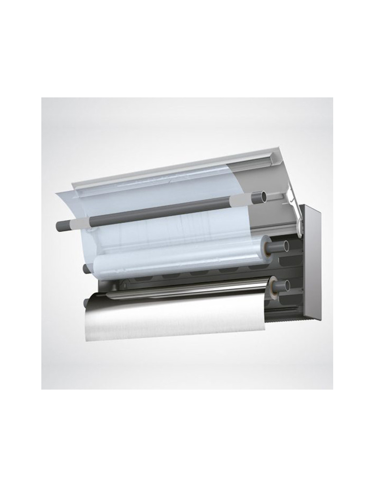 DISPENSADOR 3 ROLLOS COCINA TANGO INOX Adaptable: elige entre el portarrollos de cocina que se adapta a rollos de cualquier ancho, o el juego de 6 ganchos para colgar utensilios. Eficaz. Su tapa protectora mantiene los rollos ordenados y ocultos a la vista. 38x6x17 cm