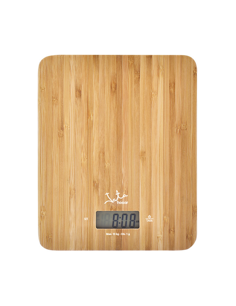 Capacidad 15 kg. Graduación 1 g. Superficie en bambú prensado de producción sostenible de 5 mm. Alta precisión electrónica. Visor “LCD” autoluminiscente. Reloj integrado. Función de tara. Funciona con 2 pilas “AAA” de 1,5 V (no incluidas). Garantía 3