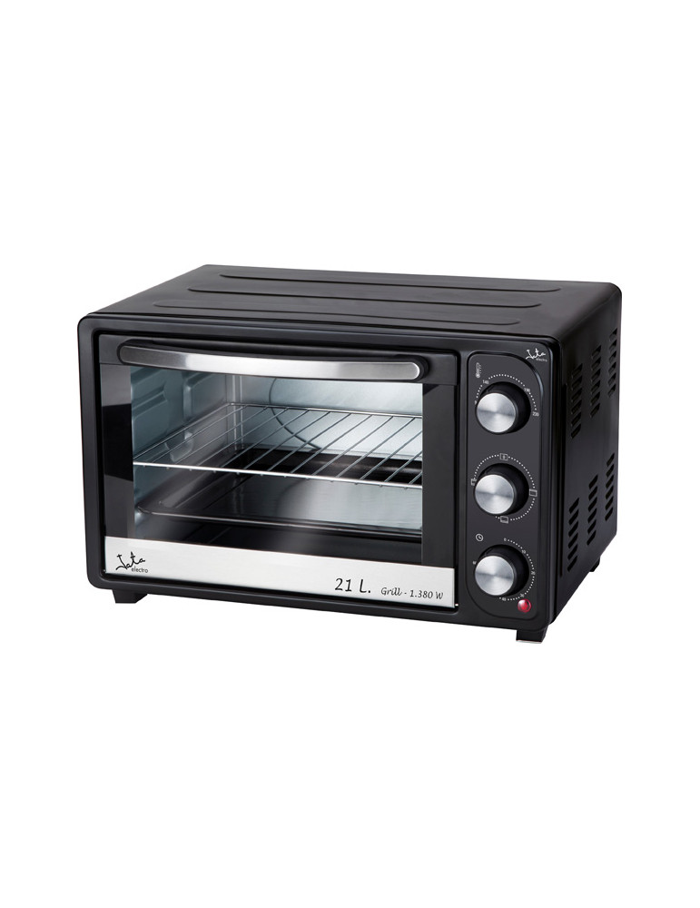 HORNO GRILL HN921 JATA 1.380 W. 21 l. Temporizador 60 minutos. Resistencias acero inoxidable. Termostato. Bandeja. Parrilla. Puerta abatible. Bandeja extraíble para fácil limpieza. Indicador luminoso. Medidas externas: 44,5 x 31 x 28,5 cm.