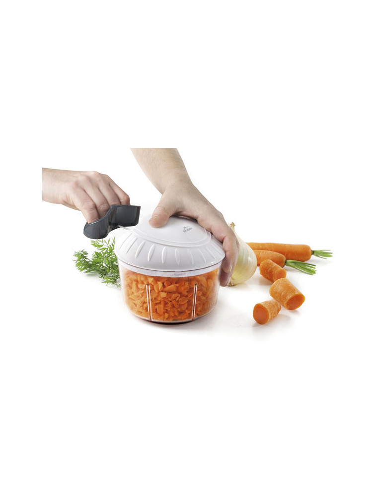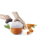 Pica todo tipo de alimentos. Tres cuchillas potentes y afiladas ultra. resistentes de acero inoxidable. Fácil y cómodo uso gracias a su sistema manual. Base antideslizante. Material libre de BPA.