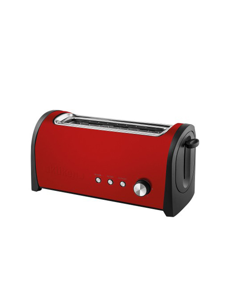 1000W de potencia. Diseño en acero inoxidable con acabado en rojo. Resistencias de gran superficie para un tostado uniforme. Selector giratorio con 6 niveles de tostado. Botones con borde luminoso; función descongelación, recalentar y parada. 1 ranu