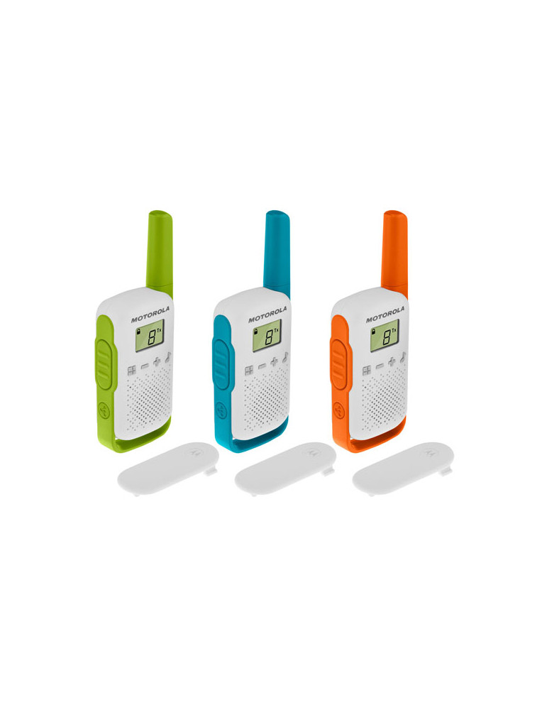 PACK 3 WALKIE TALKIE MOTOROLA T42 Alcance hasta 4km. 16 canales. 121 códigos. PMR446 de uso sin licencia. Función “Easy Pairing” de emparejamiento fácil. Bloqueo de teclado. Pantalla retroiluminada. Clip de cinturón. Función Scanner/monitor. Funciona con baterías AAA (no incluidas).