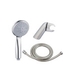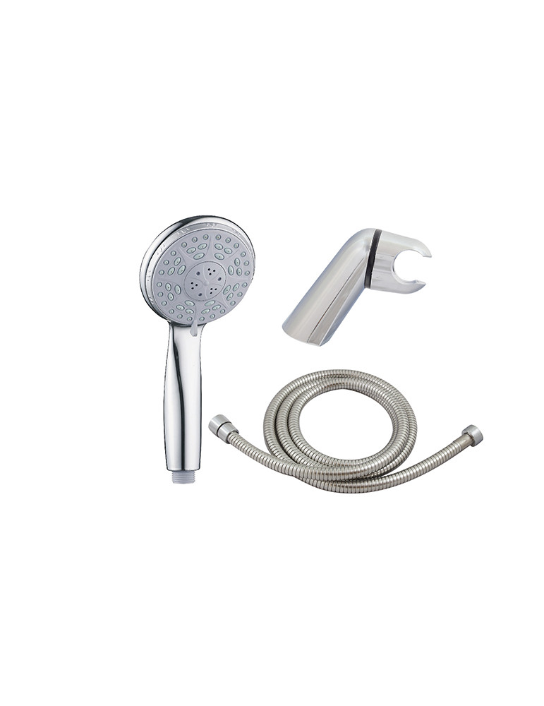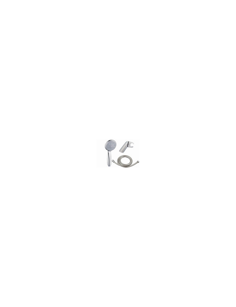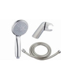 3 posiciones. Compuesto por mango de ducha, flexo y soporte. Cromado. Flexo extensible con doble refuerzo.