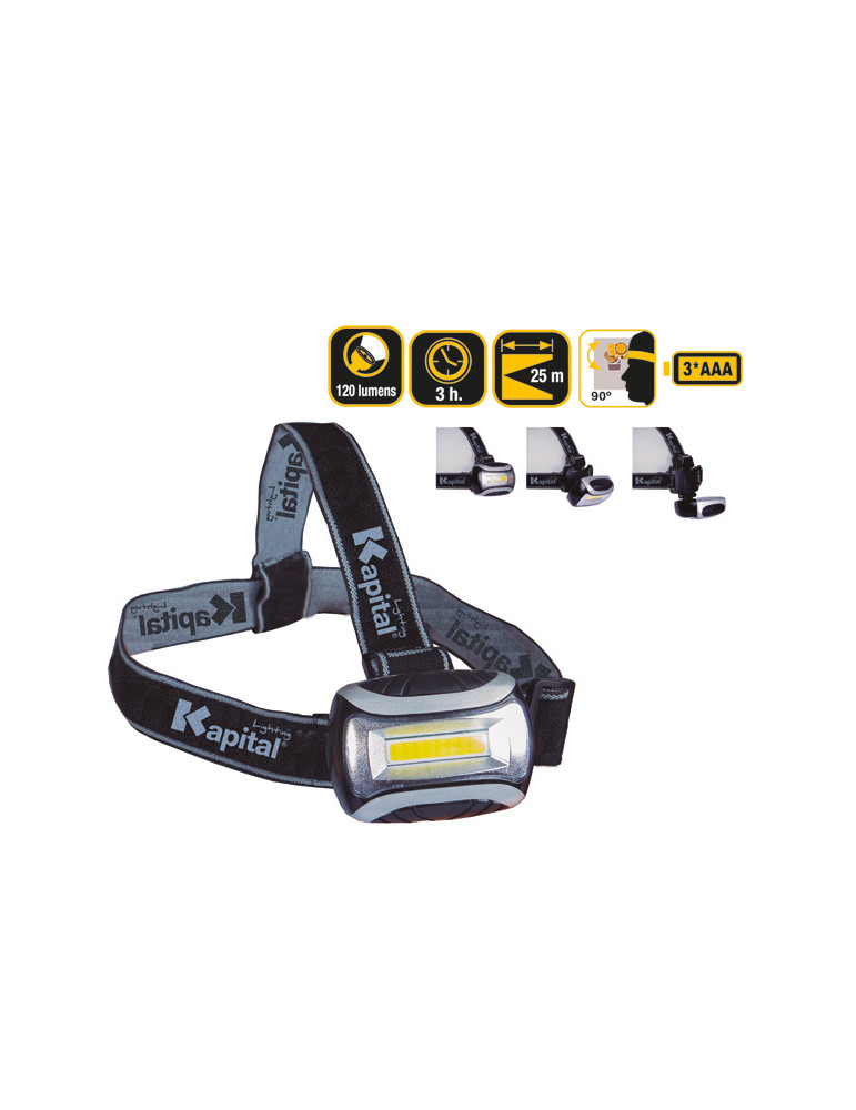 120 lúmens. Autonomía: 3 horas. Distancia del haz de luz 25 m. Ángulo de iluminación de 90° ajustable. Cuatro modos: alto - medio - bajo – intermitente. 3 pilas AAA incluidas.