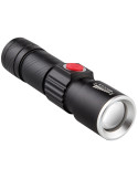 Linterna de 1 LED CREE Americano de alta potencia. Larga duración con hasta 100.000 horas de uso. Interruptor de 3 posiciones. Fabricada en aluminio de alta resistencia. Zoom de hasta cuatro aumentos. Batería recargable por USB con autonomía de 5 hor