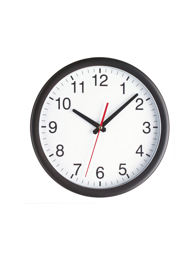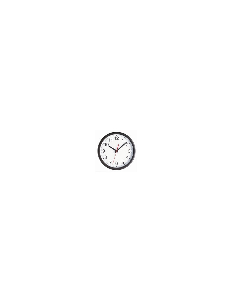 RELOJ DE PARED Esfera blanca. Caja de plástico negro con cristal. Alimentación 1 pila 1,5V AA. Diámetro 30 cm.