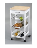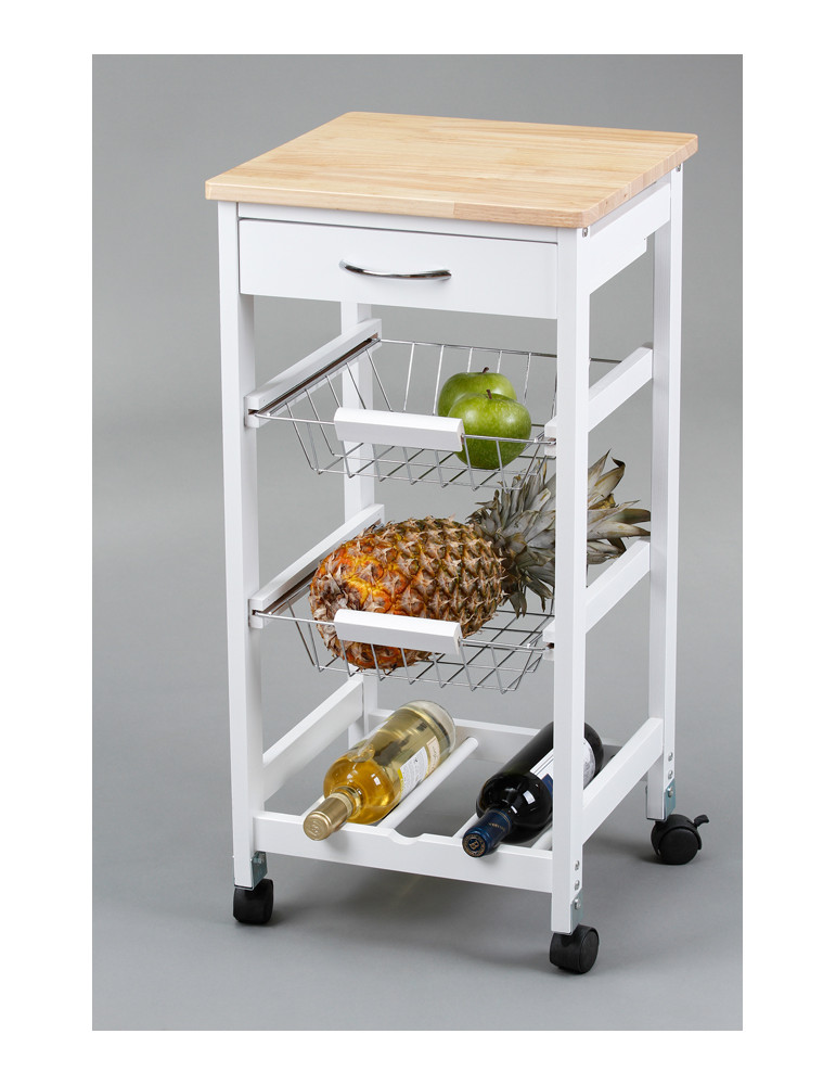 MADERA Práctico carrito auxiliar con cestas y botellero + 1 cajón. Tapa de PVC recubierta. Alto 76 cm. Ancho 37 cm. Profundo 37 cm.