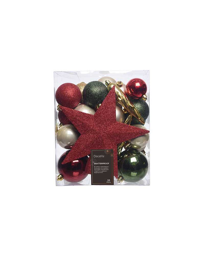 CONTIENE: UNA ESTRELLA Y 32 BOLAS SURTIDAS. COLORES: VERDE, DORADO Y ROJO