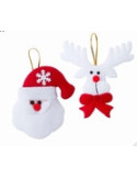Papá Noel y reno con pajarita para colgar. Suave poliéster. 15 x 17 x 1,5 cm.