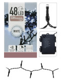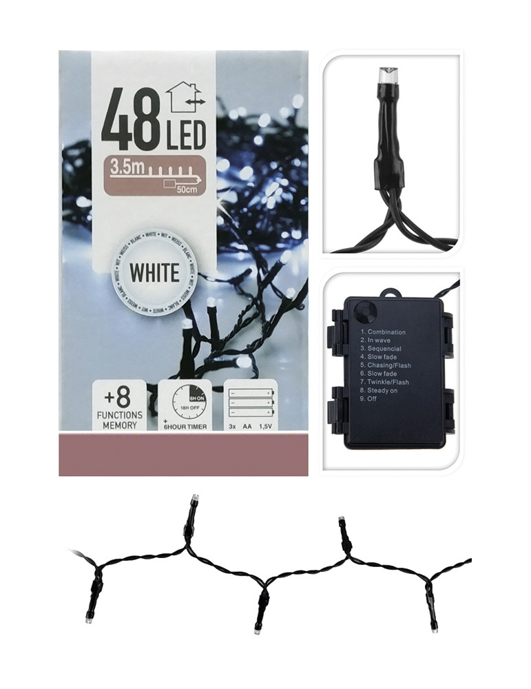 GUIRNALDA A PILAS MULTIFUNCION 48 LEDS CABLE NEGRO LUZ BLANCO FRIO PILAS 3xAA NO INCLUIDAS IP44 7,5cm ENTRE BOMBILLAS PROGRAMADOR 8 FUNCIONES CON MEMORIA + TEMPORIZADOR 6h ENCENDIDO 18h APAGADO. CABLE ALIMENTACIÓN 50cm. DISTANCIA ENTRE LA PRIMERA BOM