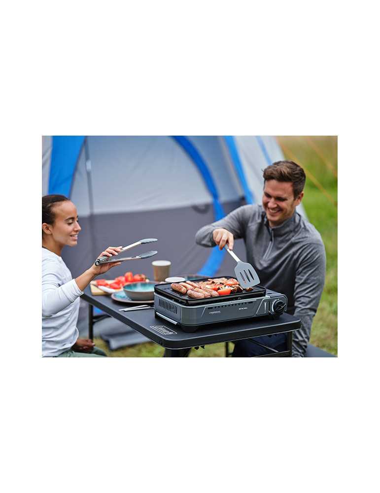 Potencia : 2000W. Consumo : de 137 g/h. Encendido piezo eléctrico. Plancha grill de aluminio fundido a presión con revestimiento antiadherente de 938 cm2. Listo para cocinar con 6m de precalentamiento. Compartimento de seguridad para cartucho CP250.