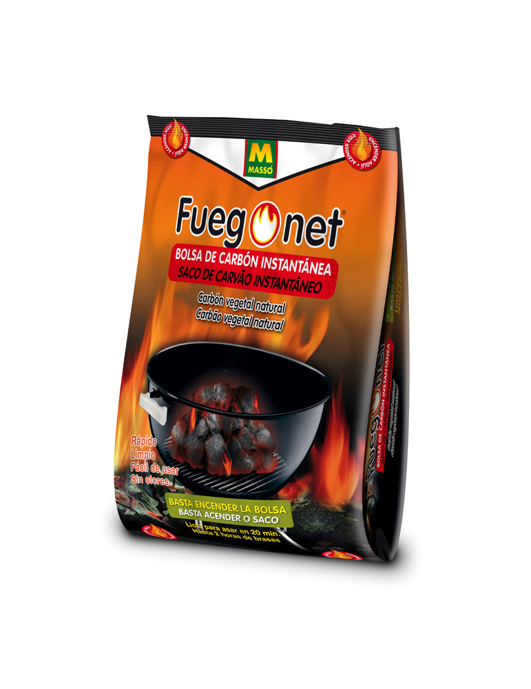 BOLSA DE CARBÓN INSTANTÁNEA Encender la bolsa y listo. Brasa uniforme en 20 minutos. Para 4-5 personas. Hasta 2 horas de brasa uniforme y constante.
