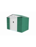 CASETA METÁLICA CAMBRIDGE Superficie total 4,72 m2. Medidas exteriores 261 (ancho) x 181 (fondo) x 198 (alto) cm. Doble puerta deslizante 109 x 157 cm y tejado a dos aguas. Verde / blanco.
