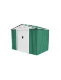 Superficie total 4,72 m2. Medidas exteriores 261 (ancho) x 181 (fondo) x 198 (alto) cm. Doble puerta deslizante 109 x 157 cm y tejado a dos aguas. Verde / blanco.