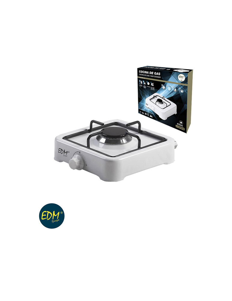 COCINA DE GAS 1 FUEGO EDM Esmaltada. 1 fuego Ø75 mm. Para utilizar con gas butano y solo en exteriores. Dimensiones: 33 x 33 x 8 cm.