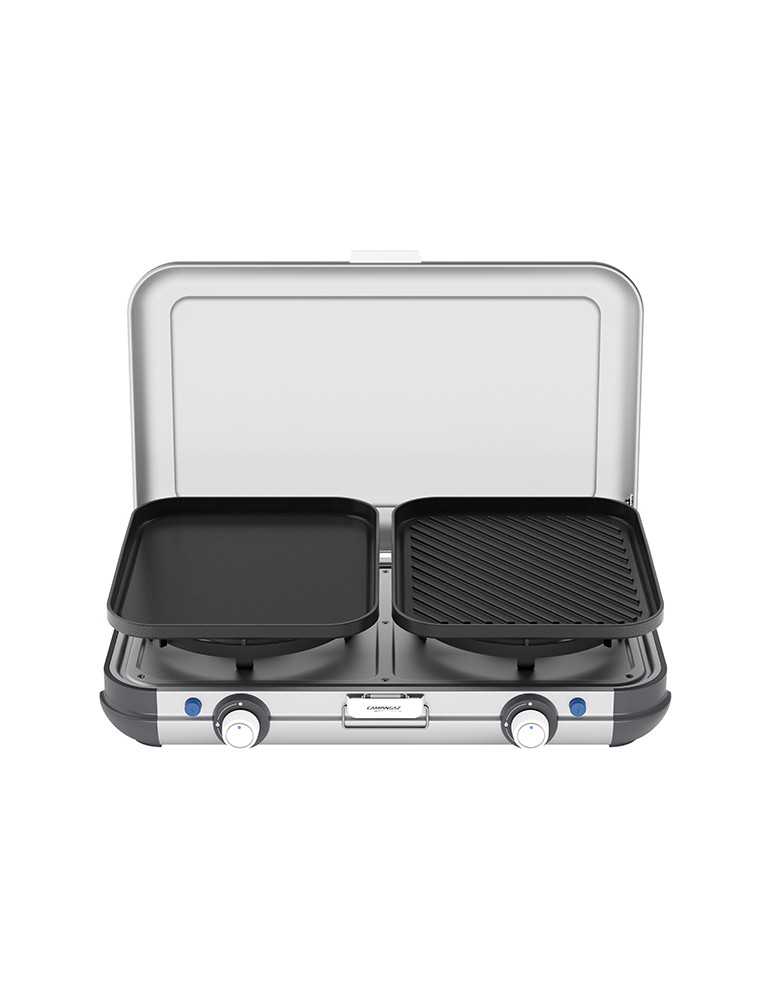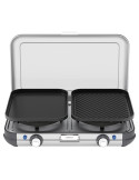 Potencia: 4000W (2000W por Quemador). Consumo de gas:1h 33m con CV470 (2 x 145 g/h). Regulador y goma integrados. Encendido: Manual con 2 piezos ; Superficie de acero inoxidable Plancha/parrilla 1000cm2 (2 superficies de 24,5 x 20cm)