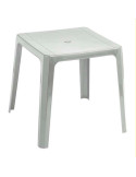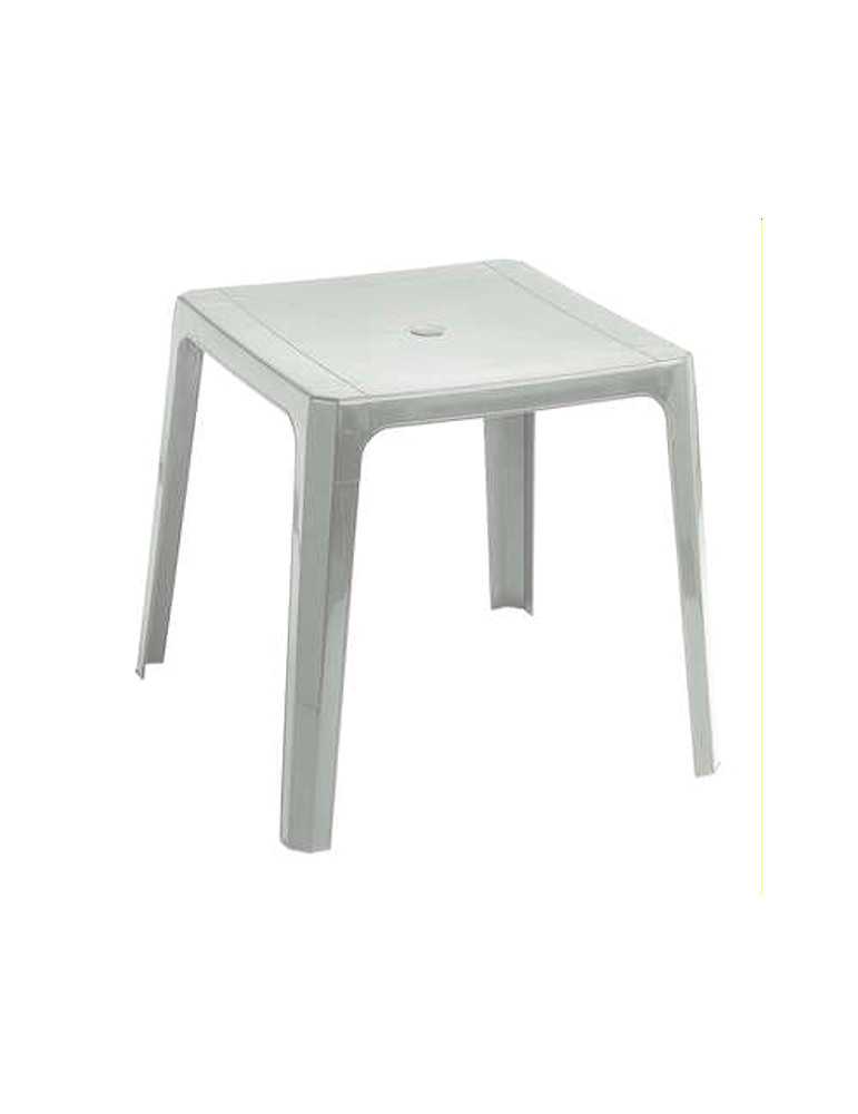 Mesa Cuadrada 70x70x72cm de alto . 4,8kg. MATERIAL: Polipropileno.Protección solar rayos UV, resistente a la intemperie. Desmontable, medida agujero mástil Ø38mm. Tacos regulables y antideslizantes. Color blanco