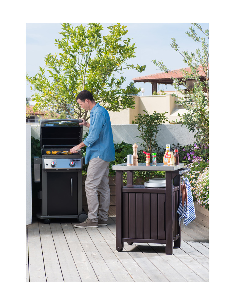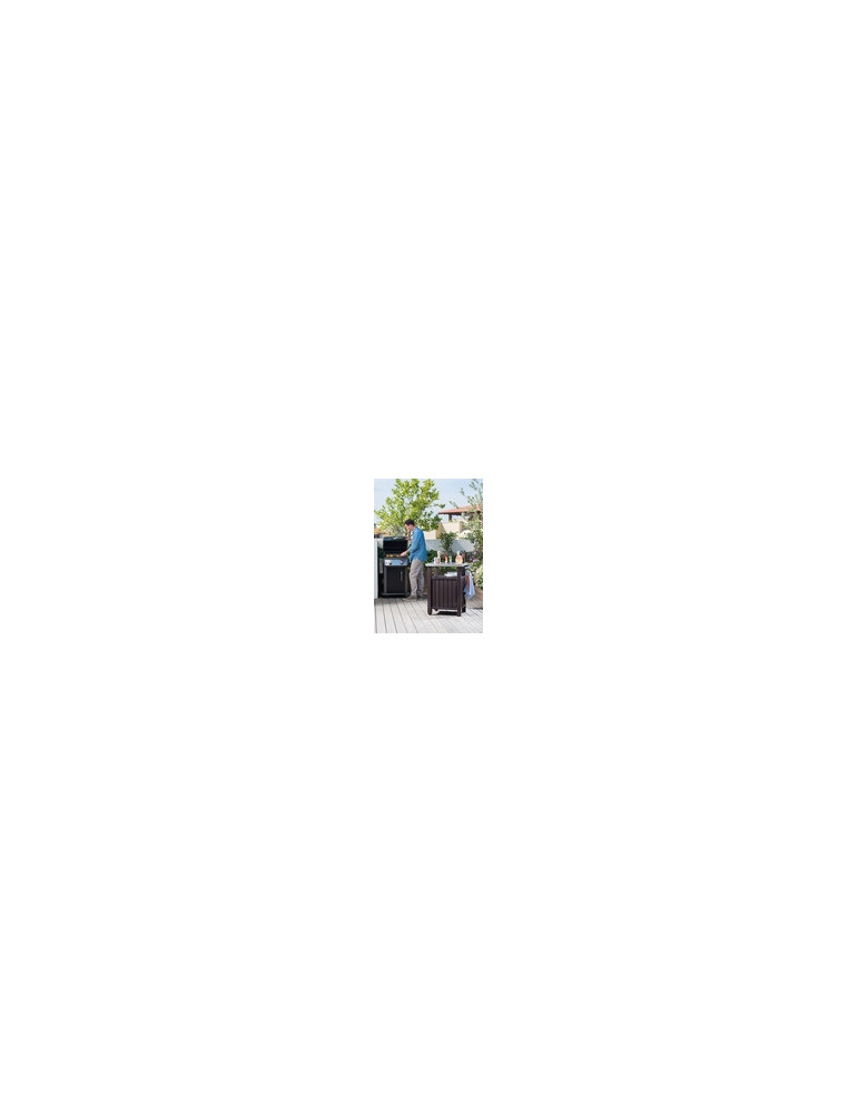 MUEBLE AUXILIAR BARBACOA Parte superior de gran dureza para poder cocinar y trabajar con seguridad. Capacidad en total 150 l. Incluye dos ruedas para fácil transporte. Fabricado en PVC de gran resistencia, preparado para todos los climas. 82 x 51,7 x 90 cm.