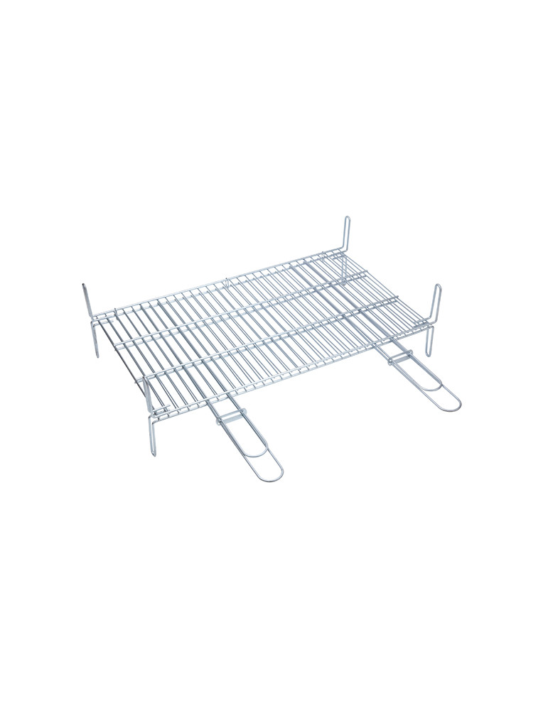 Superficie de cocción: 65x40 cm. Mangos dobles de 38,5 cm. con sistema de cierre de seguridad para facilitar su uso. Puede usarse dentro de una barbacoa, en el suelo o en una chimenea. Fabricación nacional.