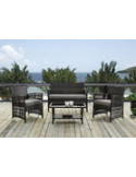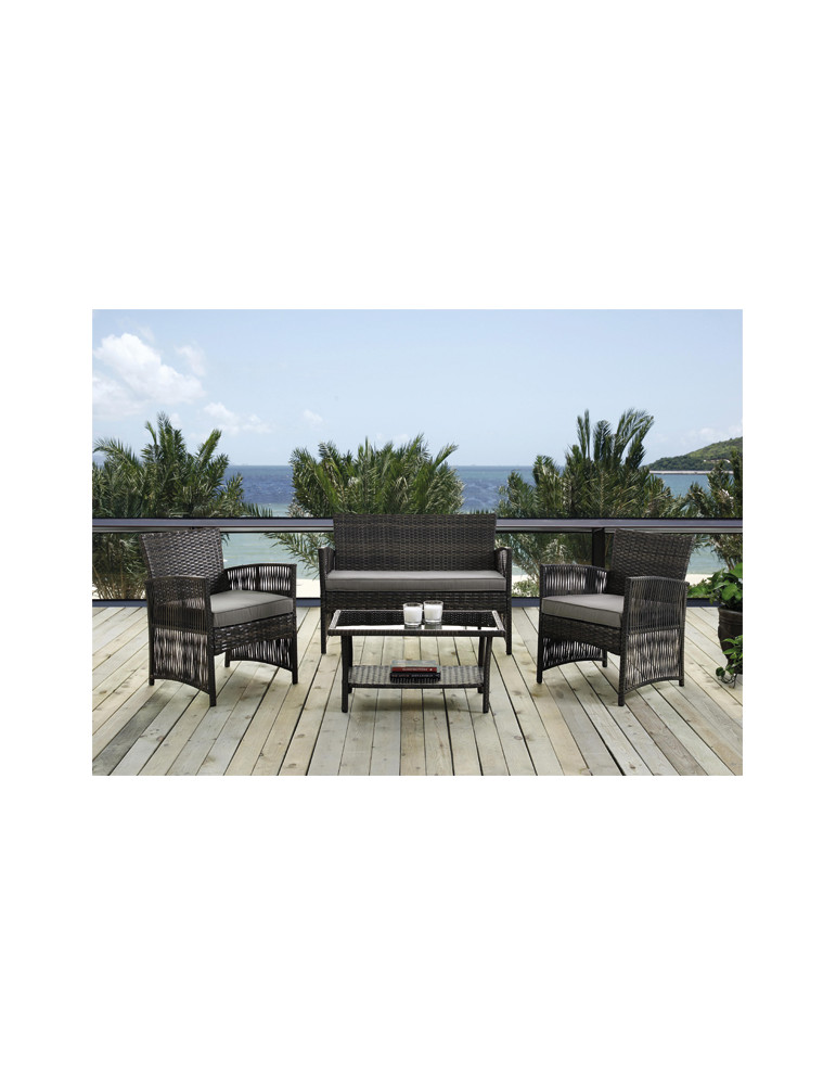 Conjunto en ratán gris oscuro. Incluye cojines en gris claro. Sofá: 113 x 67 x 76 cm, 2 sillones: 61 x 67 x 76 cm y mesa: 82 x 49 x 40 cm.