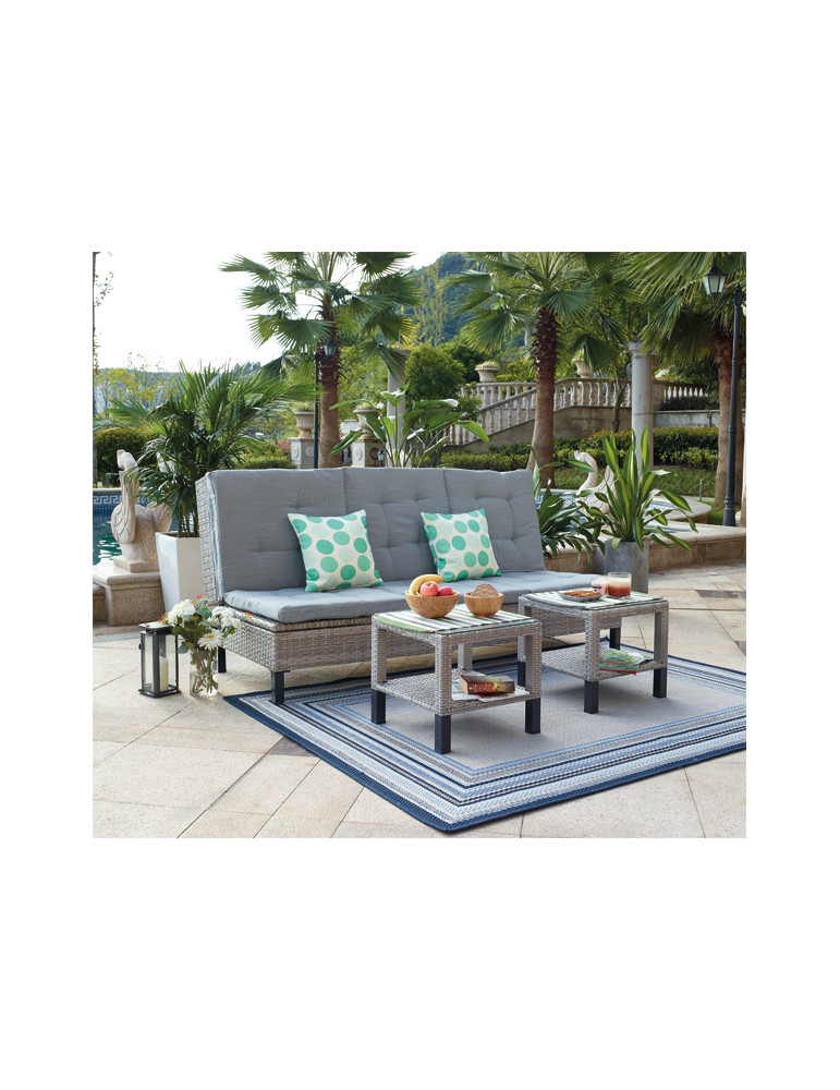 CONJUNTO multiposición Cama plegable de ratán y estructura de acero en beige y cojines grises. Cama: 195 x 130 x 31 cm. Mesa: 47 x 47 x 42 cm.