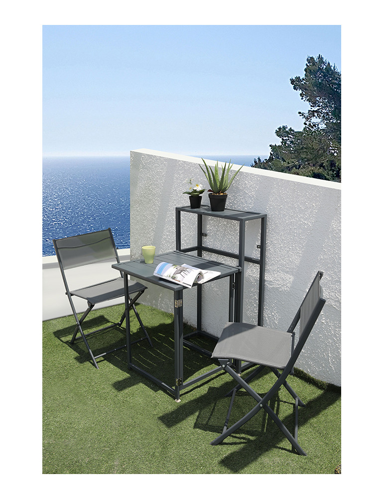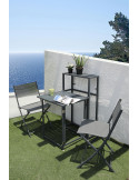 CONJUNTO HERA Conjunto de balcon plegable en acero ideal para aprovechar al maximo el espacio, para espacios reducidos. Mesa abatible y dos sillas plegables.