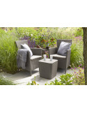 CONJUNTO IOWA BALCONY Ideal apara balcones, terrazas y espacios reducidos. Fabricado en polipropileno imitación ratán, resistente a las condiciones meteorológicas con protección contra rayos UV. Formado por mesa-arcón 39 x 39 x 43 cm y 2 sillones de 62 x 60 x 89 cm.