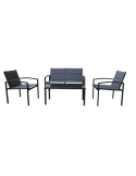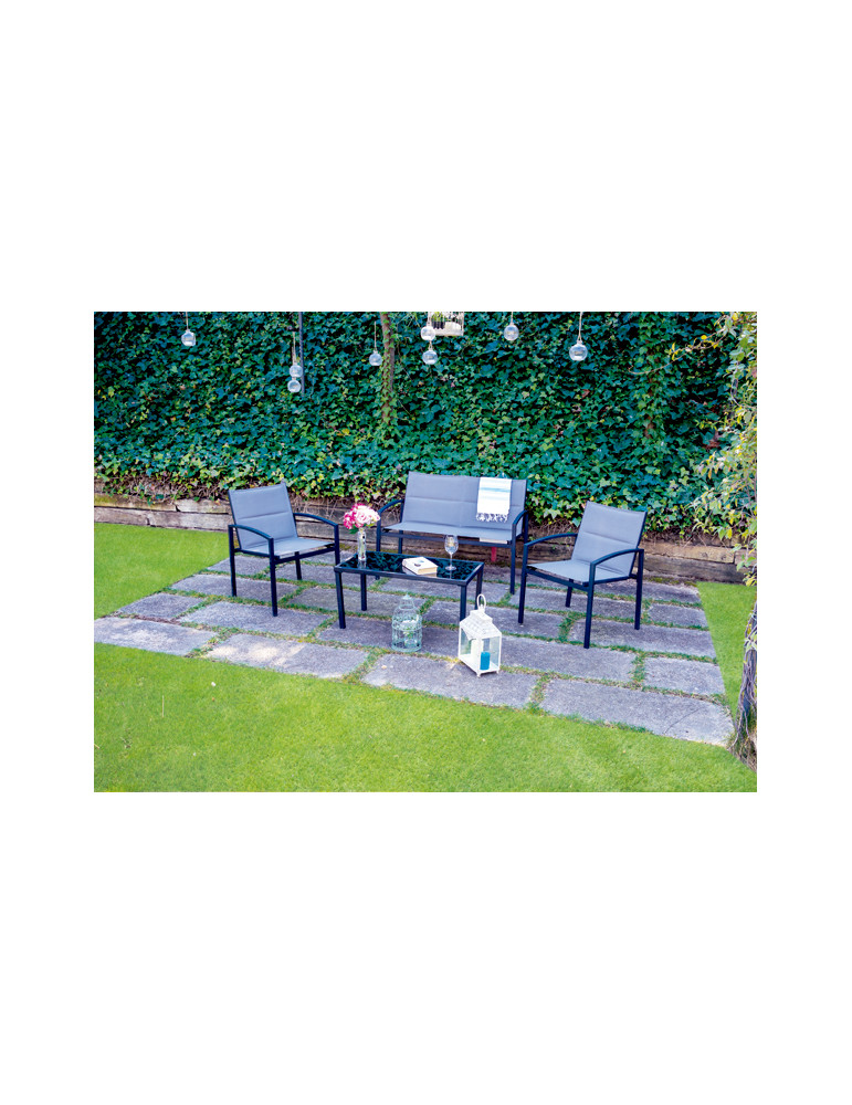 Fabricado en acero y textileno. Mesa de cristal 90 x 45 x 43 cm. 2 sillas: 65 x 58 x 80 cm. 1 sofá: 65 x 112 x 80 cm.