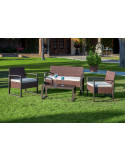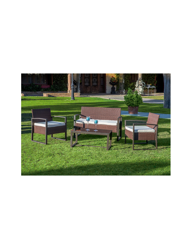 Fabricado en acero y ratán. Compuesto por mesa: 85 x 45 x 38 cm. 2 sillones: 62 x 59 x 75 cm y sofá: 113 x 56 x 75 cm.