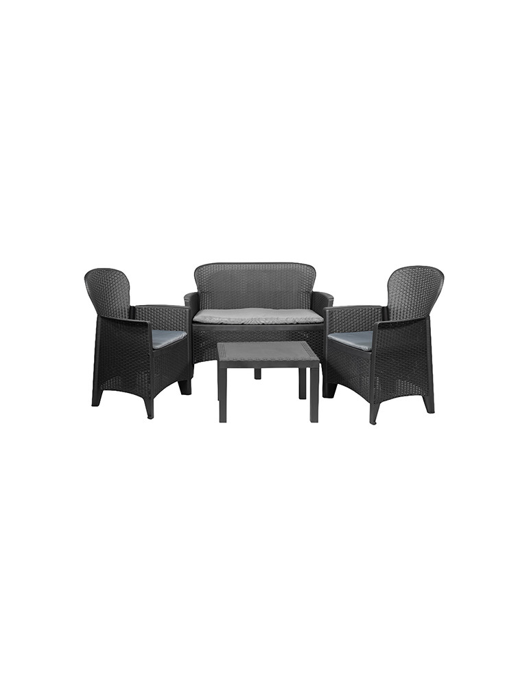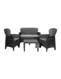 Dos sillones, un sofá y una mesa de café en color antracita. Incluye cojines. Tanto para interior como para exterior