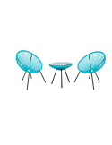 Mesa con cristal de 5 cm de grosor, 46 cm de diámetro y 45 cm de altura. 2 sillones de 70 x 80 x 85 cm. Colores turquesa o negro.