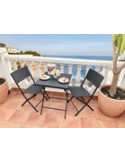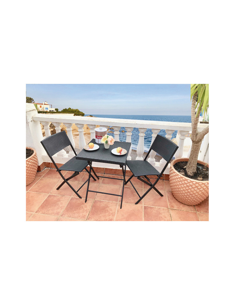 CONJUNTO balcón imitación Ratán Acero y plástico. Mesa: 58 x 58 x 71,5 cm y sillas: 45 x 46 x 80/45cm.